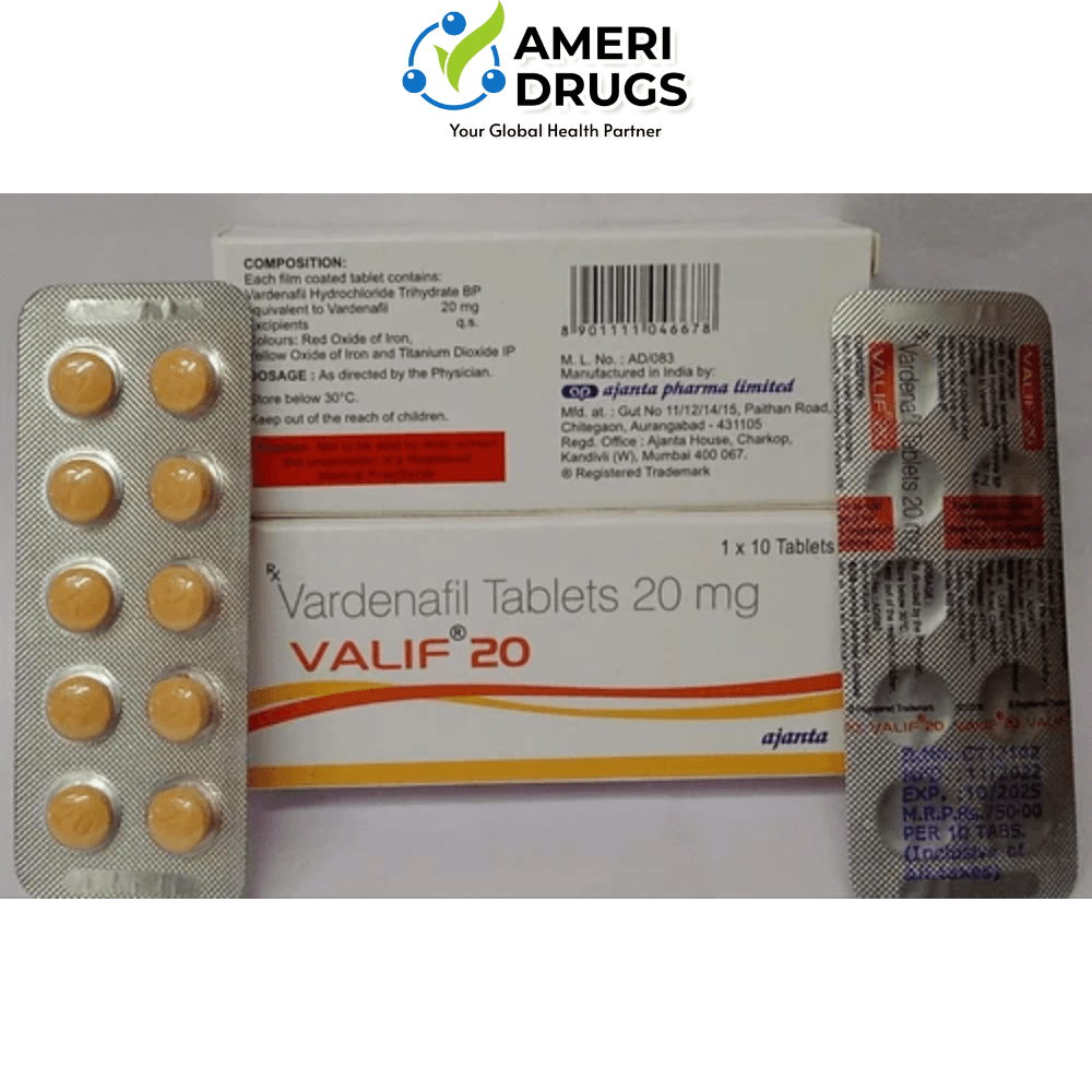 Valif 20 is a potent medication known for its efficacy in treating erectile dysfunction (ED) in men. With its active ingredient Vardenafil, Valif 20 helps men achieve and maintain firm erections necessary for satisfactory sexual activity. At Ameridrugs, a trusted pharmaceutical exporter, we prioritize delivering quality medications like Valif 20 with fast shipping options available worldwide within 6 to 8 days.